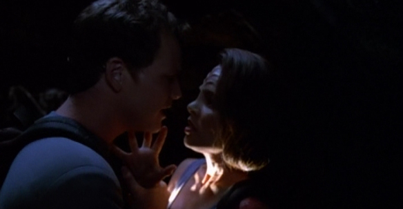 When it comes to Tom and B’Elanna, however, there seems to be a true chemistry there…one which I have yet to explain. Tom is a bit of a bumbling idiot who does his best and yet still clearly depends on the approval of others in order to validate himself. He’s played up as handsome and yet has an obvious receding hairline and not much of a body to speak of. He’s a bit clonky, though not as clonky as Riker, and appears to have been the direct inspiration for the character of “Guy” in Galaxy Quest – no real personality to speak of, but blends in well enough to flesh out some episodes where no other characters would fit. B’Elanna is a skilled, knowledgeable, capable engineer who understands complex systems in a holistic way few others seem unable to comprehend. She’s fit, strong, sharp-witted, and even those horrendously bushy eyebrows don’t take any of her beauty away. She could have anyone on the ship, probably. Heck, she could even seduce a Vulcan! And yet, she chooses Paris? Is it his thickly masked sensitive side which appeals to her? Is it the odd appeal of knowing he could never actually win her on his own, giving her some kind of control in the relationship? Is it a lack of self-respect that drives her into his arms, when she’s so desperate for love and affection that she tosses herself down in the gutter in the hopes that she’ll be swept up with his usual trash?